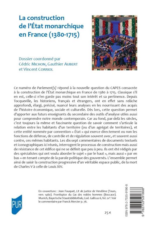 Ce numéro de Parlement[s] répond à la nouvelle question du CAPES consacrée à la construction de l’État monarchique en France de 1380 à 1715. Classique s’il en est, celle-ci n’en garde pas moins tout son intérêt et sa pertinence. Depuis Tocqueville, les historiens, français et étrangers, ont en effet sans relâche approfondi, élargi, précisé, nuancé leurs analyses en les nourrissant des acquis de l’histoire économique, sociale et culturelle. Dès lors, cette question permet d’apporter aux futurs enseignants du secondaire des outils d’analyse utiles aussi pour comprendre notre monde contemporain. Car au fond, par-delà les siècles, c’est toujours la même et fascinante question de savoir comment s’articule la relation entre les habitants d’un territoire (ou d’un agrégat de territoires), et cette entité nommée par convention « État » qui exerce directement ou non les fonctions de défense, de contrôle et de régulation souvent avec, et souvent aussi contre, ces mêmes habitants. Les dix-sept commentaires de documents textuels et iconographiques ici réunis, interrogent le processus de construction mais aussi de résistance de cet édifice qui ne se définit que peu à peu. Ils ont été rédigés par des spécialistes qui ont voulu aborder le sujet « par le haut », mais aussi « par en bas » en tenant compte de la parole politique des gouvernés. L’ensemble permet ainsi de saisir la construction progressive d’un véritable espace public, de la mort de Charles V à celle de Louis XIV.
