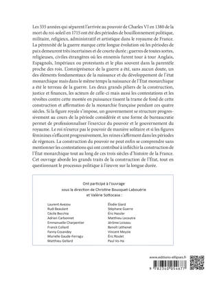 Le 335 années qui séparent l’arrivée au pouvoir de Charles VI en 1380 de la mort du roi-soleil en 1715 ont été des périodes de bouillonnement politique, militaire, religieux, administratif et artistique dans le royaume de France. La pérennité de la guerre marque cette longue évolution où les périodes de paix demeurent très incertaines et de courte durée ; guerres de toutes sortes, religieuses, civiles étrangères où les ennemis furent tour à tour Anglais, Espagnols, Impériaux ou protestants et le plus souvent dans la parentèle proche des rois. L’omniprésence de la guerre a été, sans aucun doute, un des éléments fondamentaux de la naissance et du développement de l’état monarchique mais dans le même temps la naissance de l ‘état monarchique a été le terreau de la guerre. Les deux grands piliers de la construction, justice et finances, les acteurs de celle-ci mais aussi les contestations et les révoltes contre cette montée en puissance tissent la trame de fond de cette construction et affirmation de la monarchie française pendant ces quatre siècles. Si la figure royale s’impose, un gouvernement se structure progressivement au cours de la période considérée et une forme de bureaucratie permet de professionnaliser l’exercice du pouvoir et le gouvernement du royaume. Le roi n’exerce pas le pouvoir de manière solitaire et si les figures féminines s’effacent progressivement, les reines s’affirment dans les périodes de régences. La construction du pouvoir ne peut enfin se comprendre sans mentionner les contestations qui ont contribué à infléchir la construction de l’État monarchique tout au long de ces trois siècles d’histoire de la France. Cet ouvrage aborde les grands traits de la construction de l’État, tout en questionnant le processus politique à l’œuvre sur la longue durée.