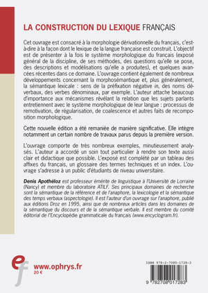 Cet ouvrage est consacré à la morphologie dérivationnelle du français, c'est-à-dire à la façon dont le lexique de la langue française est construit. L'objectif est de présenter à la fois le système morphologique du français (exposé général de la discipline, de ses méthodes, des questions qu'elle se pose, des descriptions et modélisations qu'elle a produites), et quelques avancées récentes dans ce domaine. L'ouvrage contient également de nombreux développements concernant la morphosémantique et, plus généralement, la sémantique lexicale : sens de la préfixation négative in, des noms déverbaux, des verbes dénominaux, par exemple. L'auteur attache beaucoup d'importance aux mécanismes révélant la relation que les sujets parlants entretiennent avec le système morphologique de leur langue : processus de remotivation, de régularisation, de coalescence et autres faits de recomposition morphologique.