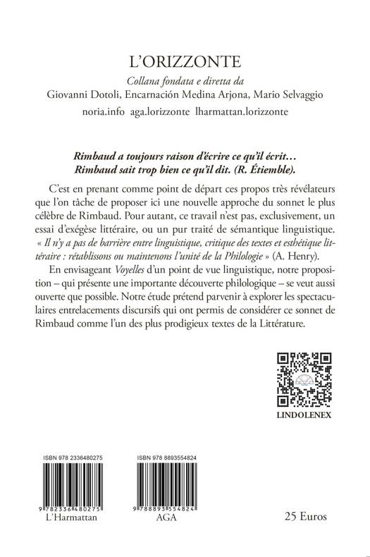C’est en prenant comme point de départ ces propos très révélateurs que l’on tâche de proposer une nouvelle approche du sonnet le plus célèbre de Rimbaud. Pour autant, ce travail n’est pas, exclusivement, un essai d’exégèse littéraire, ou un pur traité de sémantique linguistique. « Il n’y a pas de barrière entre linguistique, critique des textes et esthétique littéraire : rétablissons ou maintenons l’unité de la Philologie » (A. Henry). En envisageant Voyelles d’un point de vue linguistique, notre proposition – qui présente une importante découverte philologique – se veut aussi ouverte que possible. Notre étude prétend parvenir à explorer les spectaculaires entrelacements discursifs qui ont permis de considérer ce sonnet de Rimbaud comme l’un des plus prodigieux textes de la Littérature.