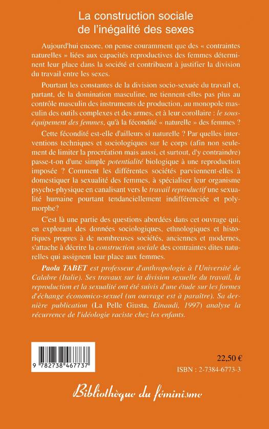 Aujourd'hui encore, on pense que des contraintes naturelles liées aux capacités reproductives des femmes déterminent leur place dans la société et contribuent à justifier la division du travail entre les sexes. A partir de données sociologiques, ethnologiques et historiques Paola Tabet s'attache à décrire la construction sociale des contraintes dites naturelles qui assignent leur place aux femmes.