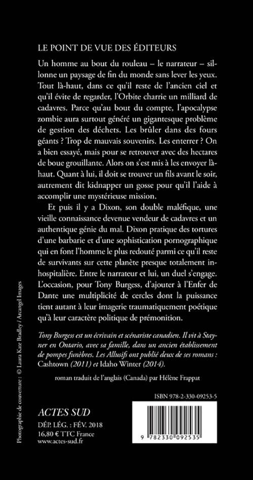 Un homme au bout du rouleau - le narrateur - sillonne un paysage de fin du monde sans lever les yeux. Tout là-haut, dans ce qu'il reste de l'ancien ciel et qu'il évite de regarder, l'Orbite charrie un milliard de cadavres. Parce qu'au bout du compte, l'apocalypse zombie aura surtout généré un gigantesque problème de gestion des déchets. Les brûler dans des fours géants ? Trop de mauvais souvenirs. Les enterrer ? On a bien essayé, mais pour se retrouver avec des hectares de boue grouillante. Alors on s'est mis à les envoyer là-haut. Quant à lui, il doit se trouver un fils avant le soir, autrement dit kidnapper un gosse pour qu'il l'aide à accomplir une mystérieuse mission.