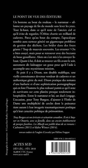 Et puis il y a Dixon, son double maléfique, une vieille connaissance devenue vendeur de cadavres et un authentique génie du mal. Dixon pratique des tortures d'une barbarie et d'une sophistication pornographique qui en font l'homme le plus redouté parmi ce qu'il reste de survivants sur cette planète presque totalement inhospitalière. Entre le narrateur et lui, un duel s'engage. L'occasion, pour Tony Burgess, d'ajouter à l'Enfer de Dante une multiplicité de cercles dont la puissance tient autant à leur imagerie traumatiquement poétique qu'à leur caractère politique de prémonition.