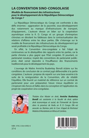 La République Démocratique du Congo est confrontée à des défis énormes: aggravation de la pauvreté, sous-développement dus notamment au manque d'infrastructures de transport, d'équipement... L'auteure dresse un bilan sur la coopération asymétrique entre la R. D. Congo et un groupe d'entreprises chinoises en décelant les faiblesses dans la contractualisation des relations d'affaires entre les deux parties. Elle s'interroge sur le modèle de financement des infrastructures du développement qui serait profitable à la République Démocratique du Congo. En effet, la Convention sino-congolaise a fait l'objet de controverses sur le déséquilibre des rapports entre les parties, car la partie chinoise a plus gagné que l'Etat congolais. Et pourtant, ce partenariat novateur, inspiré des conventions de partenariat public-privé, était censé répondre à l'insuffisance des financements traditionnels pour le développement du pays. L'ouvrage éclaire sur les conditions de conclusion de ce contrat jugé défavorable à la partie congolaise. L'auteure propose de repartir sur une base assainie à la suite de la renégociation de la Convention, afin de rétablir l'équilibre.