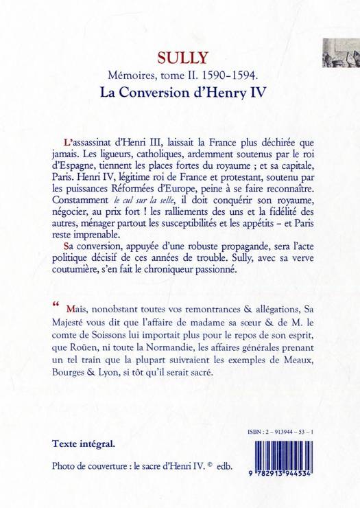 Sa conversion, appuyée d'une robuste propagande, sera l'acte politique décisif de ces années de trouble. Sully, avec sa verve coutumière, s'en fait le chroniqueur passionné.