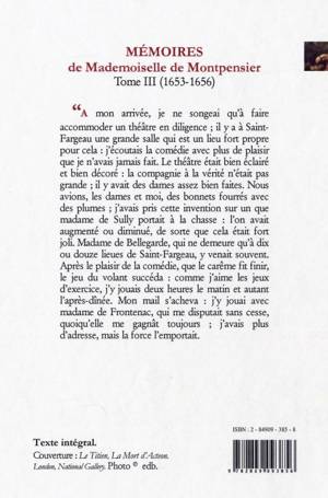 « A mon arrivée, je ne songeai qu'à taire accommoder un théâtre en diligence ; il y a à Saint-Fargeau une grande salle qui est un lieu fort propre pour cela : j'écoutais la comédie avec plus de plaisir que je n'avais jamais fait. Le théâtre était bien éclairé et bien décoré : la compagnie à la vérité n'était pas grande ; il y avait des dames assez bien faites. Nous avions, les dames et moi, des bonnets fourrés avec des plumes ; j'avais pris cette invention sur un que madame de Sully portait à la chasse : l'on avait augmenté ou diminué, de sorte que cela était fort joli. Madame de Bellegarde, qui ne demeure qu'à dix ou douze lieues de Saint-Fargeau, y venait souvent. Après le plaisir de la comédie, que le carême fit finir, le jeu du volant succéda : comme j'aime les jeux d'exercice, j'y jouais deux heures le matin et autant l'après-dînée. Mon mail s'acheva : j'y jouai avec madame de Frontenac, qui me disputait sans cesse, quoiqu'elle me gagnât toujours ; j'avais plus d'adresse, mais la force l'emportait. »