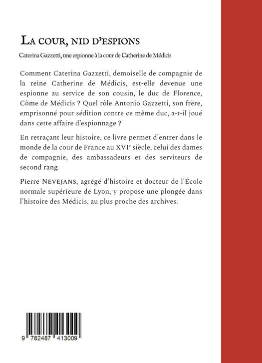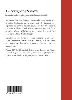 Comment Caterina Gazzetti, demoiselle de compagnie de la reine Catherine de Médicis, est-elle devenue une espionne au service de son cousin, le duc de Florence, Côme de Médicis ? Quel rôle Antonio Gazzetti, son frère, emprisonné pour sédition contre ce même duc, a-t-il joué dans cette affaire d’espionnage ? En retraçant leur histoire, ce livre permet d'entrer dans le monde de la cour de France au XVIe siècle, celui des dames de compagnie, des ambassadeurs et des serviteurs de second rang. Pierre Nevejans, agrégé d'histoire et docteur de l'Ecole normale supérieure de Lyon, y propose une plongée dans l'histoire des Médicis, au plus proche des archives.