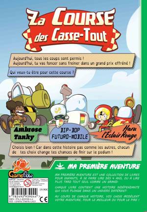 Ouvre le livre et choisis ton pilote et son véhicule : Ambrose à bord de Tanky, son char blindé. Bip-Bop, dans sa Futuro-Mobile, la merveille technologique. Ou Haru et son Éclair Rouge, le super bolide ! Maintenant, la course peut commencer. Tu vas pouvoir lire ce livre normalement, de gauche à droite, mais rapidement, tu feras face à des choix matérialisés par des pages coupées en trois. Tourne la partie de ton choix et découvre ce qu’il va se passer. Après plusieurs choix, tu arriveras à la fin de la course… Seras-tu le nouveau champion de la course des Casse-tout ? Une fois la lecture terminée, tu peux recommencer pour découvrir de nouveaux chemins ou essayer avec un autre personnage.