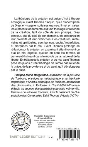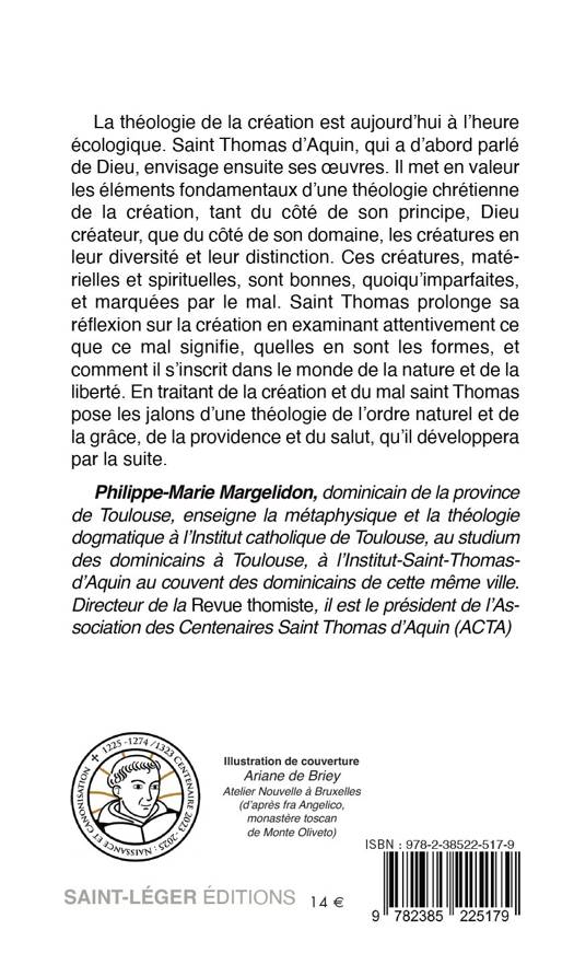 La théologie de la création est aujourd'hui à l'heure écologique. Saint Thomas d'Aquin, qui a d'abord parlé de Dieu, envisage ensuite ses oeuvres. Il met en valeur les éléments fondamentaux d'une théologie chrétienne de la création, tant du côté de son principe, Dieu créateur, que du côté de son domaine, les créatures en leur diversité et leur distinction. Ces créatures, matérielles et spirituelles, sont bonnes, quoiqu'imparfaites, et marquées par le mal. Saint Thomas prolonge sa réflexion sur la création en examinant attentivement ce que ce mal signifie, quelles en sont les formes, et comment il s'inscrit dans le monde de la nature et de la liberté. En traitant de la création et du mal saint Thomas pose les jalons d'une théologie de l'ordre naturel et de la grâce, de la providence et du salut, qu'il développera par la suite.