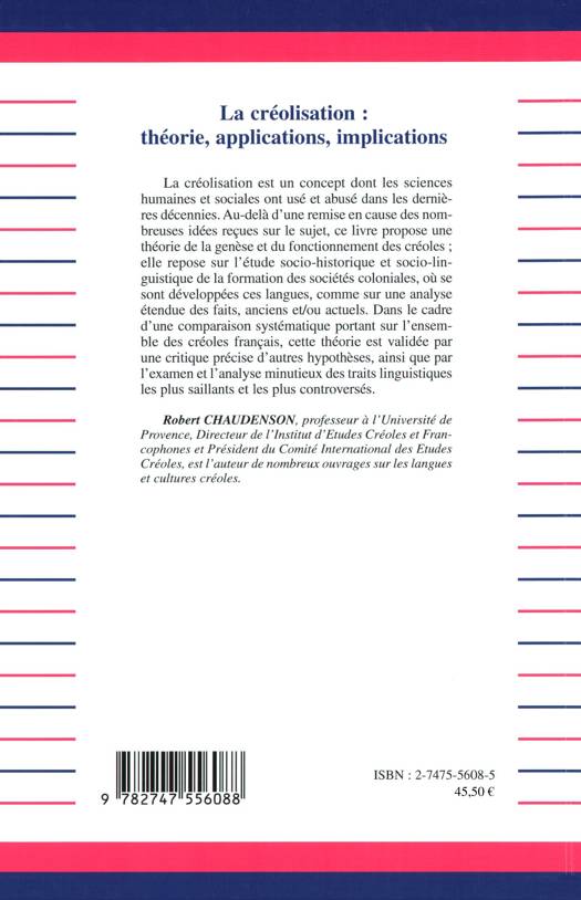 La créolisation est un concept dont les sciences humaines et sociales ont usé et abusé dans les dernières décennies. Au-delà d'une remise en cause des nombreuses idées reçues sur le sujet, ce livre propose une théorie de la genèse et du fonctionnement des créoles ; elle repose sur l'étude socio-historique et socio-linguistique de la formation des sociétés coloniales, où se sont développées ces langues, comme sur une analyse étendue des faits, anciens et/ou actuels.
