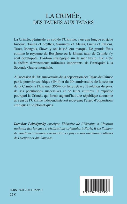 A l'occasion du 70e anniversaire de la déportation des Tatars de Crimée par le pouvoir soviétique (1944) et du soixantième anniversaire de la cession de la Crimée à l'Ukraine (1954), ce livre retrace l'évolution de ce pays, péninsule au sud de l'Ukraine, et de ses populations successives et de leurs cultures. Il explique pourquoi la Crimée, qui forme aujourd'hui une république autonome au sein de l'Ukraine indépendante, est redevenue l'enjeu d'oppositions ethniques et diplomatiques.