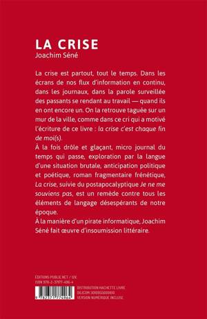 À la fois drôle et glaçant, micro journal du temps qui passe, exploration par la langue d'une situation brutale, anticipation politique (et poétique), roman fragmentaire frénétique, La crise, suivi du postapocalyptique Je ne me souviens pas, est un remède contre tous les éléments de langage désespérants de notre époque.