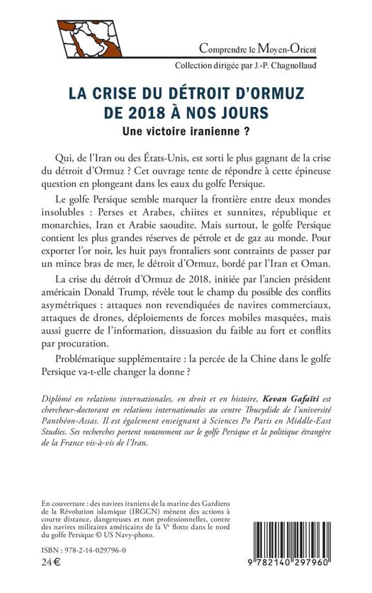 Qui, de l'Iran ou des États-Unis, est sorti le plus gagnant de la crise du détroit d'Ormuz ? Cet ouvrage tente de répondre à cette épineuse question en plongeant dans les eaux du golfe Persique. Le golfe Persique semble marquer la frontière entre deux mondes insolubles : Perses et Arabes, chiites et sunnites, république et monarchies, Iran et Arabie saoudite. Mais surtout, le golfe Persique contient les plus grandes réserves de pétrole et de gaz au monde. Pour exporter l'or noir, les huit pays frontaliers sont contraints de passer par un mince bras de mer, le détroit d'Ormuz, bordé par l'Iran et Oman. La crise du détroit d'Ormuz de 2018, initiée par l'ancien président américain Donald Trump, révèle tout le champ du possible des conflits asymétriques : attaques non revendiquées de navires commerciaux, attaques de drones, déploiements de forces mobiles masquées, mais aussi guerre de l'information, dissuasion du faible au fort et conflits par procuration. Problématique supplémentaire : la percée de la Chine dans le golfe Persique va-t-elle changer la donne ?