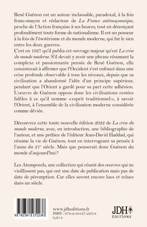 René Guénon est un auteur inclassable, paradoxal, à la fois franc-maçon et rédacteur de La France antimaçonnique, proche de l'Action française à ses heures, tout en dénonçant profondément toute forme de nationalisme. Il est un penseur à la fois de l'ésotérisme et du monde moderne, qui fut le sien entre les deux guerres. C'est en 1927 qu'il publia cet ouvrage majeur qu'est La crise du monde moderne. S'il devait y avoir une phrase résumant la complexe et passionnante pensée de René Guénon, elle consisterait à affirmer que l'Occident s'est enfoncé dans une crise profonde observable à tous les niveaux, depuis que sa civilisation a abandonné l'idée d'un principe supérieur, pendant que l'Orient a gardé pour sa part cette adhésion. L'oeuvre de Guénon oppose donc les civilisations restées fidèles à ce qu'il nomme esprit traditionnel, à savoir l'Orient, à l'ensemble de la civilisation moderne considérée comme déviée. Découvrez cette toute nouvelle édition 2022 de La crise du monde moderne, avec, en introduction, une bibliographie de l'auteur, et une préface de l'éditeur Jean-David Haddad, qui résume la vie de Guénon, tout en interrogeant sa pensée à l'aune du 21e siècle. Mais que penserait donc Guénon du monde d'aujourd'hui ?