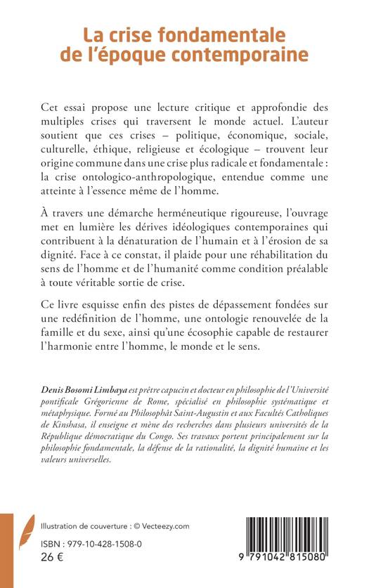 Cet essai propose une lecture critique et approfondie des multiples crises qui traversent le monde actuel. L'auteur soutient que ces crises - politique, économique, sociale, culturelle, éthique, religieuse et écologique - trouvent leur origine commune dans une crise plus radicale et fondamentale: la crise ontologico-anthropologique, entendue comme une atteinte à l'essence même de l'homme. À travers une démarche herméneutique rigoureuse, l'ouvrage met en lumière les dérives idéologiques contemporaines qui contribuent à la dénaturation de l'humain et à l'érosion de sa dignité. Face à ce constat, il plaide pour une réhabilitation du sens de l'homme et de l'humanité comme condition préalable à toute véritable sortie de crise. Ce livre esquisse enfin des pistes de dépassement fondées sur une redéfinition de l'homme, une ontologie renouvelée de la famille et du sexe, ainsi qu'une écosophie capable de restaurer l'harmonie entre l'homme, le monde et le sens.