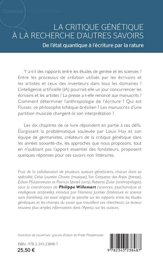 Y a-t-il des rapports entre les études de genèse et les sciences ? Entre les processus de création utilisés par les écrivains et les artistes et ceux des inventeurs dans tous les domaines ? L’intelligence artificielle (IA) pourrait-elle un jour concurrencer les écrivains et les artistes ? La presse a-t-elle renoncé aux manuscrits ? Comment déterminer l’anthropologie de l’écriture ? Qui est Flusser, ce philosophe tchèque-brésilien ? Les manuscrits d’une partition musicale changent-ils son interprétation ? Élargissant la problématique soulevée par Louis Hay et son équipe de germanistes, créateurs de la critique génétique dans les années soixante-dix, les approches proposées, tout en n’oubliant pas l’apport essentiel des fondateurs, apportent des réponses pour ces savoirs non littéraires.
