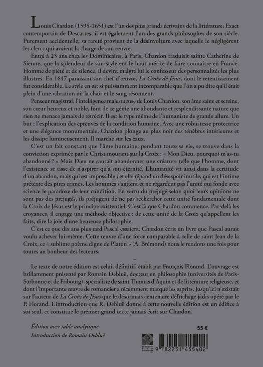 Louis Chardon (1595-1651) est l'un des plus grands ecrivains de la litterature. Exact contemporain de Descartes, il est egalement l'un des grands philosophes de son siecle. Purement accidentelle, sa rarete provient de la desinvolture avec laquelle le negligerent les clercs qui avaient la charge de son oeuvre. Entre a 23 ans chez les Dominicains, a Paris, Chardon traduisit sainte Catherine de Sienne, que la splendeur de son style eut le haut merite de faire connaitre en France. Homme de piete et de silence, il devint malgre lui le confesseur des personnalites les plus illustres. En 1647 paraissait son chef-d'oeuvre, La Croix de Jesus, dont le retentissement fut considerable. Le style en est si puissamment incomparable que l'on a pu dire qu'il etait plein d'une vibration ou la chair et le sang resonnent. Penseur magistral, l'intelligence majestueuse de Louis Chardon, son ame saine et sereine, son coeur heureux et noble, font de ce genie une abondante et resplendissante nature que rien ne menace jamais de retrecir. Il est le type meme de l'humaniste de grande allure. Un but: l'explication des epreuves de la condition humaine. Avec une robustesse protectrice et une elegance monumentale, Chardon plonge au plus noir des tenebres interieures et les dissipe lumineusement. Il marche sur les eaux. C'est un fait constant que l'ame humaine, pendant toute sa vie, se trouve dans la conviction exprimee par le Christ mourant sur la Croix: Mon Dieu, pourquoi m'as-tu abandonne ? Mais Dieu ne saurait abandonner une creature telle que l'homme, dont l'existence se tisse de n'aspirer qu'a son eternite. L'humanite vit ainsi dans la certitude d'un abandon, mais qui est impossible; et elle repand un desespoir inutile, qui est l'intime pretexte des pires crimes. Les hommes s'agitent et ne regardent pas l'unite qui fonde avec science le paradoxe de leur condition. En vertu du prejuge selon quoi leurs opinions ne sont pas des prejuges, ils prejugent de ne pas rechercher cette unite fondamentale dont la Croix de Jesus est le principe existentiel. C'est la que Chardon commence. Par-dela les croyances, il engage une methode objective: de cette unite de la Croix qu'appellent les faits, dire la joie d'une heureuse philosophie. C'est ce que dix ans plus tard Pascal essaiera. Chardon ecrit un livre que Pascal aurait voulu achever lui-meme. Cette oeuvre d'une force comparable a celle de saint Jean de la Croix, ce sublime poeme digne de Platon (A. Bremond) nous le rendons une fois pour toutes au bonheur des lecteurs. Le texte de notre edition est celui, definitif, etabli par Francois Florand. L'ouvrage est brillamment presente par Romain Deblue, docteur en philosophie (universites de Paris- Sorbonne et de Fribourg), specialiste de saint Thomas d'Aquin et de litterature religieuse, et dont l'importante oeuvre de romancier a recemment marque les esprits. Jusqu'ici n'existait sur l'auteur de La Croix de Jesus que le desormais centenaire defrichage jadis opere par le P. Florand. L'introduction que R. Deblue donne a cette nouvelle edition est un edifice a soi seul, et constitue le premier grand texte jamais ecrit sur Chardon.