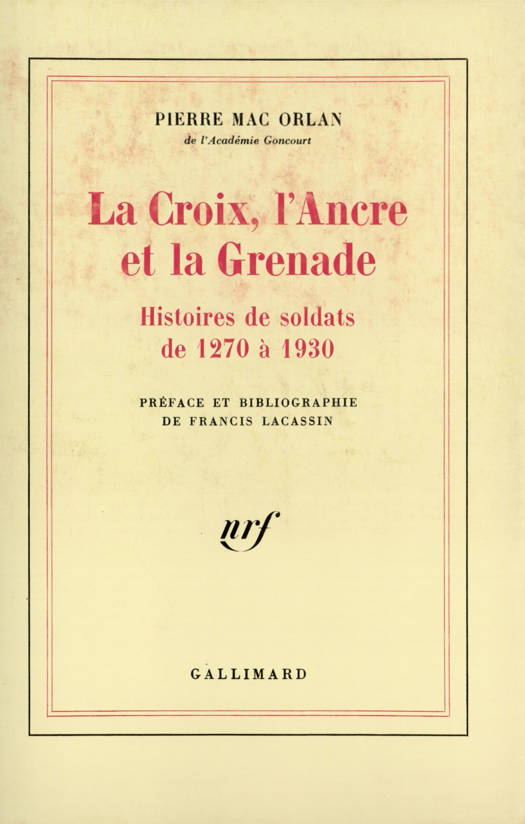 "Dès que je fus vêtu en soldat, je me sentis libre. J'étais un homme comme les autres : je pouvais manger à ma faim. La crasse de ma misère ancienne fut dissoute, lavée comme par magie. Je possédais un complet, des complets propres et sans trou. Je ne subissais plus l'échec immédiat de mes projets les plus timides. Je pouvais même mentir à mon aise et me composer une vie ancienne à peu près honorable." Telle fut, en 1906, l'issue honorable à l'impasse misérable que constituait l'existence de Pierre Mac Orlan. Ces confidences, faites à l'âge de soixante-cinq ans, ne forment pas un simple post-scriptum nostalgique d'une vie sublimée dans l'écriture. Avec elles, Mac Orlan nous livre le chiffre secret de son oeuvre et nous désigne le personnage qui domine toute son inspiration : le soldat. Au fil des ans, Mac Orlan a composé ce recueil dont le titre est emprunté à trois emblèmes : celui des armées de l'Ancien Régime, celui de l'Infanterie de Marine, celui de l'Infanterie tout court. Le soldat selon Mac Orlan est un émule de François Villon qui chercherait le salut parmi les soldats de Kipling.