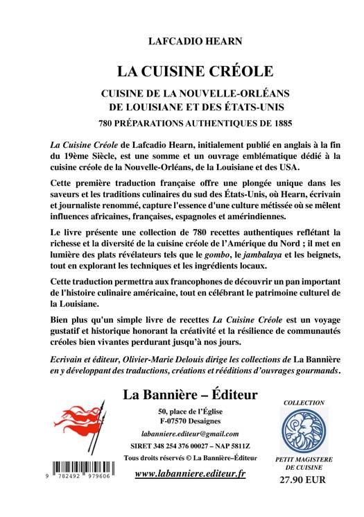 "La Cuisine créole" de Lafcadio Hearn,initialement publié en anglais àla fin du 19ème Siècle,est une somme et un ouvrage emblématique dédié àla cuisine de la Nouvelle-Orléans, de la Louisiane et des USA.
