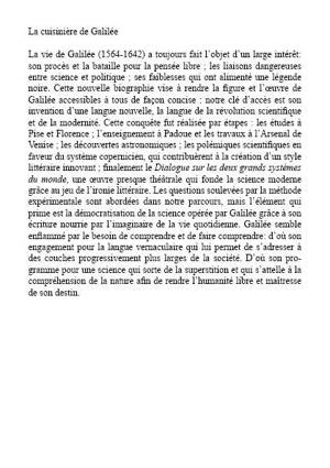 La vie de Galilée (1564-1642) a toujours fait l'objet d'un large intérêt : son procès et la bataille pour la pensée libre ; les liaisons dangereuses entre science et politique : ses faiblesses qui ont alimenté une légende noire. Cette nouvelle biographie vise à rendre la figure et l'oeuvre de Galilée accessibles à tous de façon concise : notre clé de lecture est son invention d'une langue nouvelle, la langue de la révolution scientifique et de la modernité. Cette conquête fut réalisée par étapes : les études à Pise et Florence ; l'enseignement à Padoue et les travaux à l'Arsenal de Venise ; les découvertes astronomiques ; les polémiques scientifiques en faveur du système copernicien, qui contribuèrent à la création d'un style littéraire innovant ; finalement le Dialogue sur les deux grands systèmes du monde, une oeuvre presque théâtrale qui fonde la science moderne grâce au jeu de l'ironie littéraire. Les questions soulevées par la méthode expérimentale sont abordées dans notre parcours, mais l'élément qui prime est la démocratisation de la science opérée par Galilée grâce à son écriture nourrie par l'imaginaire de la vie quotidienne. Galilée semble enflammé par le besoin de comprendre et de faire comprendre : d'où son engagement pour la langue vernaculaire qui lui permet de s'adresser à des couches progressivement plus larges de la société. D'où son programme pour une science qui sorte de la superstition et qui s'attelle à la compréhension de la nature afin de rendre l'humanité libre et maîtresse de son destin.