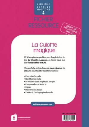 25 fiches photocopiables pour l'exploitation du livre La Culotte magique en classe ainsi que des fiches Rallye-lecture.