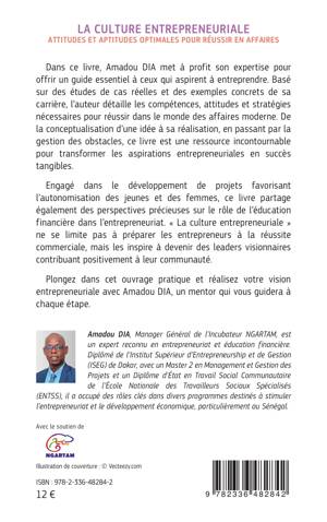 Dans ce livre, Amadou DIA met à profit son expertise pour offrir un guide essentiel à ceux qui aspirent à entreprendre. Basé sur des études de cas réelles et des exemples concrets de sa carrière, l'auteur détaille les compétences, attitudes et stratégies nécessaires pour réussir dans le monde des affaires moderne. De la conceptualisation d'une idée à sa réalisation, en passant par la gestion des obstacles, ce livre est une ressource incontournable pour transformer les aspirations entrepreneuriales en succès tangibles. Engagé dans le développement de projets favorisant l'autonomisation des jeunes et des femmes, ce livre partage également des perspectives précieuses sur le rôle de l'éducation financière dans l'entrepreneuriat. La culture entrepreneuriale ne se limite pas à préparer les entrepreneurs à la réussite commerciale, mais les inspire à devenir des leaders visionnaires contribuant positivement à leur communauté.