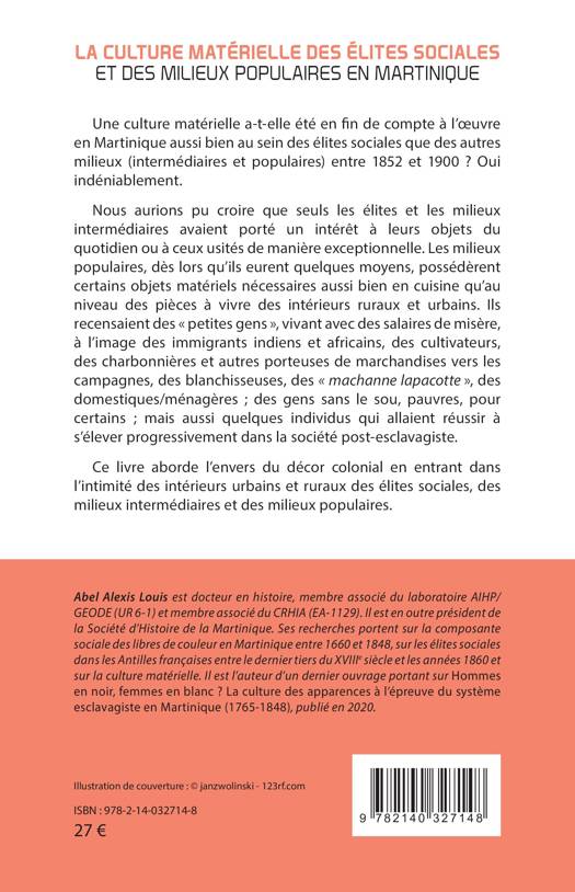 Une culture matérielle a-t-elle été en fin de compte à l'œuvre en Martinique aussi bien au sein des élites sociales que des autres milieux (intermédiaires et populaires) entre 1852 et 1900 ? Oui indéniablement. Nous aurions pu croire que seuls les élites et les milieux intermédiaires avaient porté un intérêt à leurs objets du quotidien ou à ceux usités de manière exceptionnelle. Les milieux populaires, dès lors qu'ils eurent quelques moyens, possédèrent certains objets matériels nécessaires aussi bien en cuisine qu'au niveau des pièces à vivre des intérieurs ruraux et urbains. Ils recensaient des « petites gens », vivant avec des salaires de misère, à l'image des immigrants indiens et africains, des cultivateurs, des charbonnières et autres porteuses de marchandises vers les campagnes, des blanchisseuses, des « machanne lapacotte », des domestiques/ménagères ; des gens sans le sou, pauvres, pour certains ; mais aussi quelques individus qui allaient réussir à s'élever progressivement dans la société post-esclavagiste. Ce livre aborde l'envers du décor colonial en entrant dans l'intimité des intérieurs urbains et ruraux des élites sociales, des milieux intermédiaires et des milieux populaires.