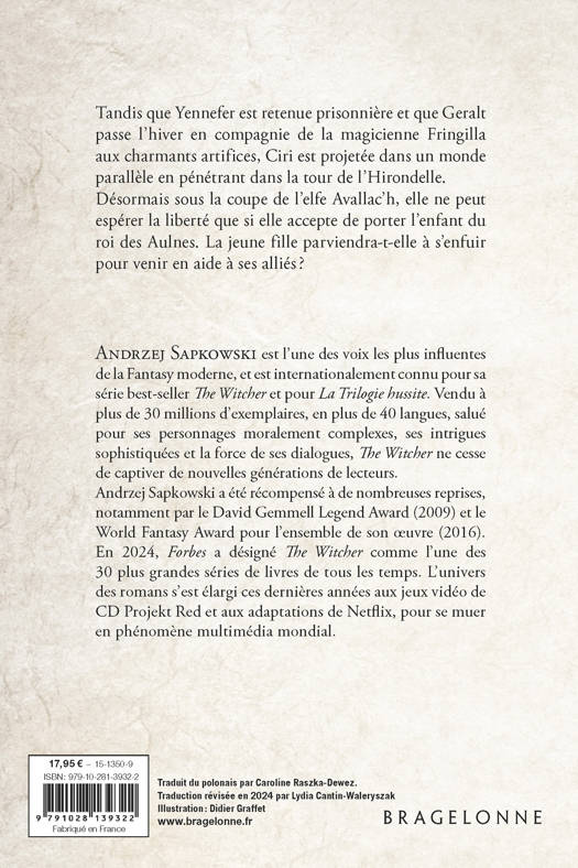 Tandis que Yennefer est retenue prisonnière et que Geralt passe l'hiver en compagnie de la magicienne Fringilla aux charmants artifices, Ciri est projetée dans un monde parallèle en pénétrant dans la tour de l'Hirondelle. Désormais sous la coupe de l'elfe Avallac'h, elle ne peut espérer la liberté que si elle accepte de porter l'enfant du roi des Aulnes. La jeune fille parviendra-t-elle à s'enfuir pour venir en aide à ses alliés ?