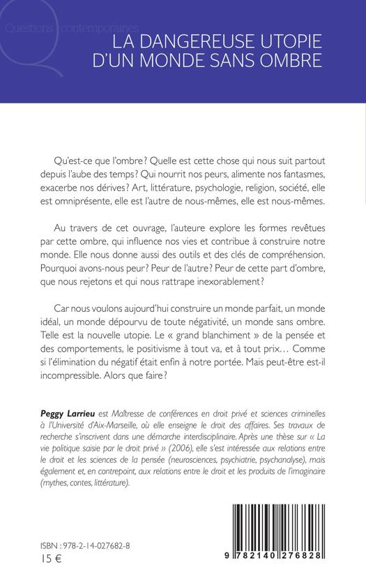 Qu'est-ce que l'ombre ? Quelle est cette chose qui nous suit partout depuis l'aube des temps ? Qui nourrit nos peurs, alimente nos fantasmes, exacerbe nos dérives ? Art, littérature, psychologie, religion, société, elle est omniprésente, elle est l'autre de nous-mêmes, elle est nous-mêmes. Au travers de cet ouvrage, l'auteure explore les formes revêtues par cette ombre, qui influence nos vies et contribue à construire notre monde. Elle nous donne aussi des outils et des clés de compréhension. Pourquoi avons-nous peur ? Peur de l'autre ? Peur de cette part d'ombre, que nous rejetons et qui nous rattrape inexorablement ? Car nous voulons aujourd'hui construire un monde parfait, un monde idéal, un monde dépourvu de toute négativité, un monde sans ombre. Telle est la nouvelle utopie. Le « grand blanchiment » de la pensée et des comportements, le positivisme à tout va, et à tout prix. Comme si l'élimination du négatif était enfin à notre portée. Mais peut-être est-il incompressible. Alors que faire ?