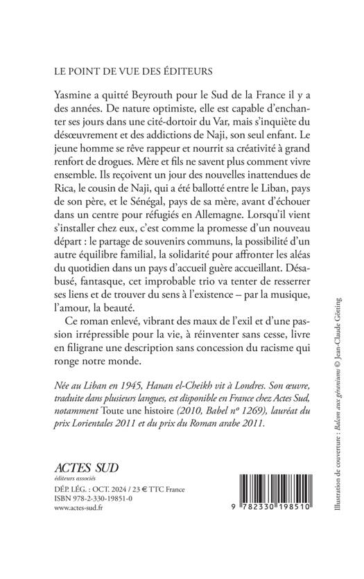 Yasmine a quitté Beyrouth pour le Sud de la France il y a des années. De nature optimiste, elle est capable d'enchanter ses jours dans une cité-dortoir du Var, mais s'inquiète du désoeuvrement et des addictions de Naji, son seul enfant. Le jeune homme se rêve rappeur et nourrit sa créativité à grand renfort de drogues. Mère et fils ne savent plus comment vivre ensemble. Ils reçoivent un jour des nouvelles inattendues de Rica, le cousin de Naji, qui a été ballotté entre le Liban, pays de son père, et le Sénégal, pays de sa mère, avant d'échouer dans un centre pour réfugiés en Allemagne. Lorsqu'il vient s'installer chez eux, c'est comme la promesse d'un nouveau départ : le partage de souvenirs communs, la possibilité d'un autre équilibre familial, la solidarité pour affronter les aléas du quotidien dans un pays d'accueil guère accueillant. Désabusé, fantasque, cet improbable trio va tenter de resserrer ses liens et de trouver du sens à l'existence - par la musique, l'amour, la beauté. Ce roman enlevé, vibrant des maux de l'exil et d'une passion irrépressible pour la vie, à réinventer sans cesse, livre en filigrane une description sans concession du racisme qui ronge notre monde.