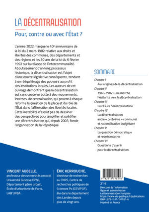 Cet ouvrage pose un regard rétrospectif sur le vaste mouvement de décentralisation qui s’est opéré essentiellement depuis le début des années 1980, période inaugurant ce que l’on appelle communément « l’acte I ». Quelques retours sur les périodes précédentes, et tout particulièrement aux sources de l’organisation territoriale moderne de la France (la Révolution française), permettent d’esquisser une mise en perspective d’un peu plus de deux siècles. Ce faisant, les auteurs s’attacheront également à mettre en évidence les principales questions d’avenir qui se dégagent de ce continuum de réformes, lesquelles se multiplient depuis 40 ans : quid de l’articulation des prérogatives et de l’exercice du pouvoir entre État et collectivités territoriales ? Quel avenir pour l’inter-territorialité ? Qu’en sera-t-il de la démocratie locale ?