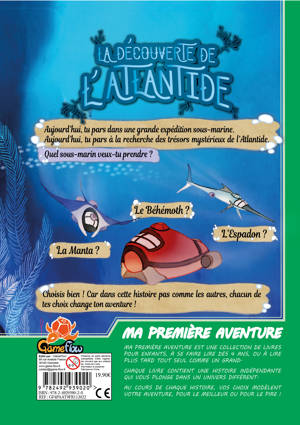 Ouvre le livre et choisis ton sous-marin sur la roue rouge : L’espadon fin et rapide, la Manta gracieuse et maniable ou le Béhémoth gros et solide ? Maintenant, ton expédition sous-marine peut commencer. Tu vas pouvoir lire ce livre normalement, de gauche à droite, mais rapidement, tu feras face à des choix matérialisés par des pages coupées en trois. Tourne la partie de ton choix et découvre ce qu’il va se passer. Après plusieurs choix, tu arriveras à la fin de ton aventure... Réussiras-tu à trouver le trésor de l’Atlantide ?