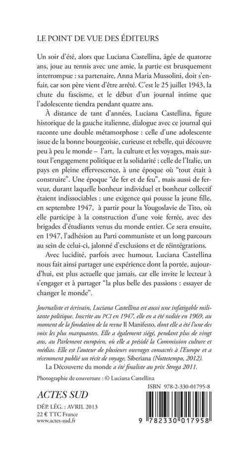 À distance de tant d'années, Luciana Castellina, figure historique de la gauche italienne, dialogue avec ce journal qui raconte une double métamorphose : celle d'une adolescente issue de la bonne bourgeoisie, curieuse et rebelle, qui découvre peu à peu le monde - l'art, la culture et les voyages, mais surtout l'engagement politique et la solidarité ; celle de l'Italie, un pays en pleine effervescence, à une époque où "tout était à construire". Une époque "de fer et de feu", mais aussi de ferveur, durant laquelle bonheur individuel et bonheur collectif étaient indissociables : une exigence qui pousse la jeune fille, en septembre 1947, à partir pour la Yougoslavie de Tito, où elle participe à la construction d'une voie ferrée, avec des brigades d'étudiants venus du monde entier. Ce sera ensuite, en 1947, l'adhésion au Parti communiste et un long parcours au sein de celui-ci, jalonné d'exclusions et de réintégrations.