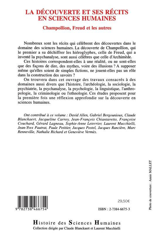 Nombreux sont les récits qui célèbrent des découvertes dans le domaine des sciences humaines. Ces histoires correspondent-elles à une réalité, ou ne sont-elles que des façons de dire des mythes, voire des illusions ? Ces études dans les domaines de l'histoire, l'archéologie, la sociologie, la psychanalyse, la linguistique, l'ethnologie, proposent une réflexion approfondie sur la découverte en sciences humaines.