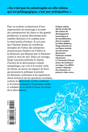 La décroissance implique, non seulement, de revoir le régime systématique de croissance de la production, de la consommation et de la pollution, mais aussi de sortir de l’économie. Ce projet est celui d’un changement sociétal, voire civilisationnel, pour la reconstruction d’un monde commun, et doit se confronter à tous les problèmes du vivre ensemble. Il se situe dans le champ de ce que l’on peut appeler aujourd’hui la métapolitique, englobant un spectre large des préoccupations de la société civile, et ne peut être cantonné à la politique politicienne, ses programmes et ses promesses électorales. En revanche, fortement impactée par le politique au sens le plus large de l’organisation de la cité, la société civile, pour y parvenir, doit mettre en oeuvre un rapport de force dans le champ sociétal et pousser le pouvoir en place à prendre les décisions qui respectent ses volontés. La décolonisation de l’imaginaire qu’implique le projet décroissant, doit appréhender nombre de questions concrètes et pas seulement celle de l’impérialisme de l’économie. Les croyances, les valeurs et les pratiques de la (dé)civilisation occidentale moderne sont remises en cause et, plus particulièrement, la question de la démocratie, du bien commun et des biens communs, de l’économie sociale et solidaire et de la laïcité que cet essai se propose d’aborder. Questions spécifiques à la France et, pour partie, à l’Europe, qui ne sont pas nécessairement celles que se poseraient des militants postcroissance de sociétés de culture islamique, africaine, ou amérindienne – toute société s’inscrivant dans une histoire et un héritage –mais elles ont un impact sur eux car l’effondrement de la société mondialisée de croissance ferait resurgir la diversité culturelle en réaction à l’uniformisation planétaire. C’est à partir des héritages complexes et divers qu’il échoira à chaque société de se reconstruire dans un dialogue interculturel. Ce combat métapolitique devient, aujourd’hui, une lutte titanesque car les bases plus ou moins traditionnelles du vivre ensemble (le territoire, la langue, les valeurs communes) fondant une identité héritée ou choisie, sont sapées systématiquement par les pires venins de la contrerévolution néolibérale victorieuse, aggravant les crises provoquées par la déterritorialisation engendrée par la mondialisation de l’économie et les migrations suscitées par la misère, les guerres et le changement climatique. Face au rouleau compresseur d’une méga-machine du mensonge à la main des entrepreneurs du chaos et des grands prédateurs, ce projet peut sembler dérisoire et le combat pour la vérité perdu d’avance. À ceci près que les faits sont têtus et que l’histoire nous donne de nombreux exemples de l’échec des entreprises monstrueuses fondées sur l’hubris et la démesure qui finissent par se fracasser contre le mur du réel. Cet essai vise à contribuer à la construction d’un grand récit de la décroissance à opposer à celui de la croissance et du progrès. Il doit avoir son mot à dire sur à peu près tous les aspects de la réalité, en laissant néanmoins ouvertes de nombreuses questions destinées à trouver des solutions circonstanciées et provisoires, inventées par les acteurs eux-mêmes de ces nouveaux mondes.