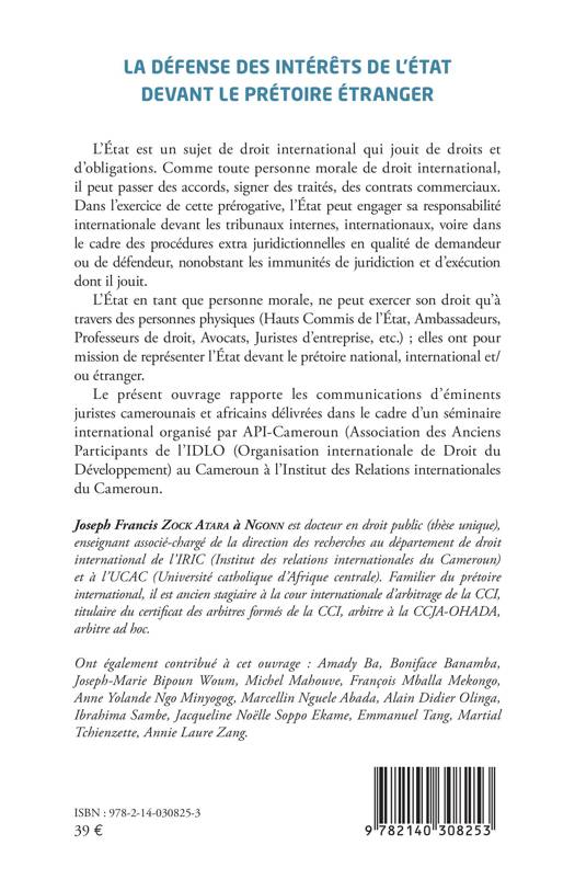 L'État est un sujet de droit international qui jouit de droits et d'obligations. Comme toute personne morale de droit international, il peut passer des accords, signer des traités, des contrats commerciaux. Dans l'exercice de cette prérogative, l'État peut engager sa responsabilité internationale devant les tribunaux internes, internationaux, voire dans le cadre des procédures extra juridictionnelles en qualité de demandeur ou de défendeur, nonobstant les immunités de juridiction et d'exécution dont il jouit. L'État en tant que personne morale, ne peut exercer son droit qu'à travers des personnes physiques (Hauts Commis de l'État, Ambassadeurs, Professeurs de droit, Avocats, Juristes d'entreprise, etc.); elles ont pour mission de représenter l'État devant le prétoire national, international et/ou étranger. Le présent ouvrage rapporte les communications d'éminents juristes camerounais et africains délivrées dans le cadre d'un séminaire international organisé par API-Cameroun (Association des Anciens Participants de l'IDLO (Organisation internationale de Droit du Développement) au Cameroun à l'Institut des Relations internationales du Cameroun.
