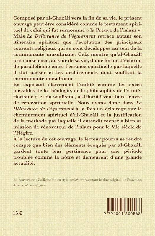 Composé par al-Ghazâlî vers la fin de sa vie, le présent ouvrage peut être considéré comme le testament spirituel de celui qui fut surnommé « la Preuve de l’islam ». Mais La Délivrance de l’égarement retrace autant son itinéraire spirituel que l’évolution des principaux courants religieux qui se sont développés au sein de la communauté musulmane. Cela montre qu’al-Ghazâlî prit conscience, au soir de sa vie, d’une forme d’écho ou de parallélisme entre l’errance spirituelle par laquelle il dut passer et les déchirements dont souffrait la communauté musulmane. En exposant clairement l’utilité comme les excès possibles de la théologie, de la philosophie, de l’« intériorisme » et du soufisme, al-Ghazâlî veut faire œuvre de rénovation spirituelle. Nous avons donc dans La Délivrance de l’égarement à la fois un éclairage sur le cheminement spirituel d’al-Ghazâlî et la justification de la méthode par laquelle il entendit mener à bien sa mission de rénovateur de l’islam pour le VIe siècle de l’Hégire. À la lecture de cet ouvrage, le lecteur pourra se rendre compte que bien des éléments évoqués par al-Ghazâlî gardent toute leur pertinence pour une période troublée comme la nôtre et demeurent d’une grande actualité.