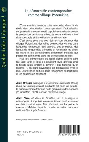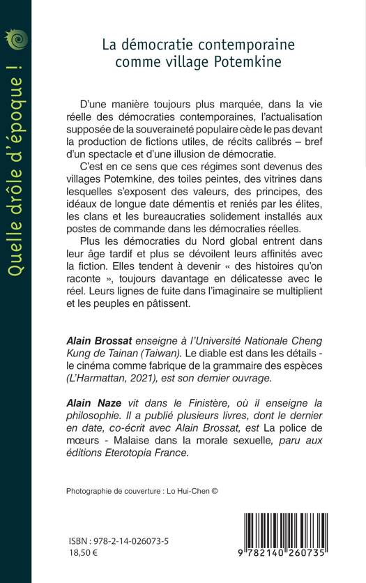 D’une manière toujours plus marquée, dans la vie réelle des démocraties contemporaines, l’actualisation supposée de la souveraineté populaire cède le pas devant la production de fictions utiles, de récits calibrés - bref d’un spectacle et d’une illusion de démocratie. C’est en ce sens que ces régimes sont devenus des villages Potemkine, des toiles peintes, des vitrines dans lesquelles s’exposent des valeurs, des principes, des idéaux de longue date démentis et reniés par les élites, les clans et les bureaucraties solidement installés aux postes de commande dans les démocraties réelles. Plus les démocraties du Nord global entrent dans leur âge tardif et plus se dévoilent leurs affinités avec la fiction. Elles tendent à devenir « des histoires qu’on raconte », toujours davantage en délicatesse avec le réel. Leurs lignes de fuite dans l’imaginaire se multiplient et les peuples en pâtissent.