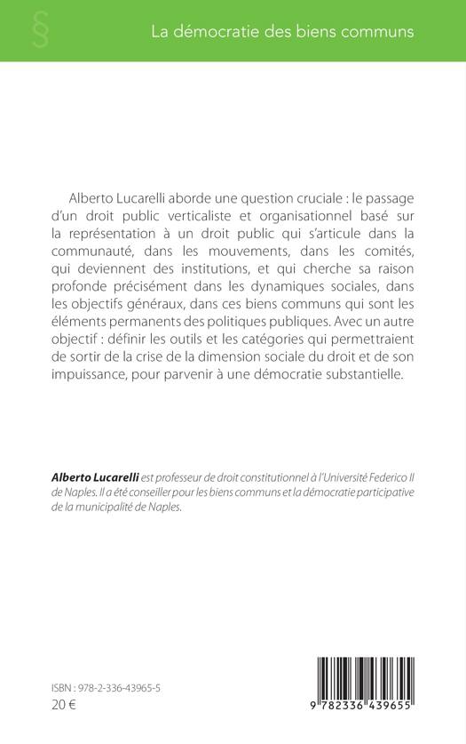 Alberto Lucarelli aborde une question cruciale  : le passage d'un droit public verticaliste et organisationnel basé sur la représentation à un droit public qui s'articule dans la communauté, dans les mouvements, dans les comités, qui deviennent des institutions, et qui cherche sa raison profonde précisément dans les dynamiques sociales, dans les objectifs généraux, dans ces biens communs qui sont les éléments permanents des politiques publiques. Avec un autre objectif : définir les outils et les catégories qui permettraient de sortir de la crise de la dimension sociale du droit et de son impuissance, pour parvenir à une démocratie substantielle