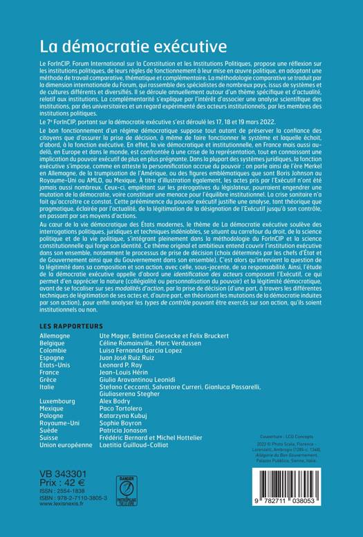 Ouvrage issu du 7e Forum qui s'est tenu du 17 au 19 mars 2022 sur le thème de "La Démocratie exécutive". Au-delà d'une contradiction apparente, la « démocratie exécutive » met en exergue un point central de nos régimes : l'organisation, la distribution et la séparation des pouvoirs, lesquelles ont pour objectif d'assurer l'équilibre au sein des régimes politiques. Cette fonction exécutive, étudiée à l'aune de la démocratie, suppose d'abord de s'interroger sur sa légitimité, en commençant par identifier ses acteurs. Ensuite, la démocratie exécutive est une démocratie de l'action, grâce à des actes de nature diversifiée, élaborés selon des procédures qui le sont tout autant et qui peuvent conduire à une mutation de la démocratie du fait de l'exécutif. Dans le prolongement de la logique de la séparation des pouvoirs, cette action suppose, enfin, un contrôle, qu'il soit institutionnel ou non-institutionnel.