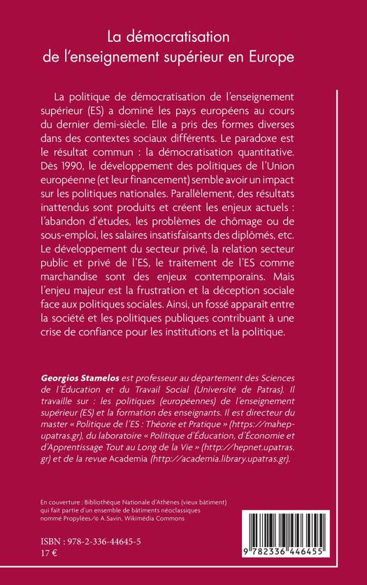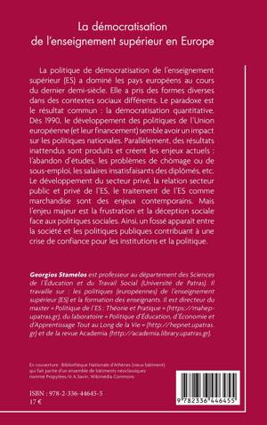 La politique de démocratisation de l'enseignement supérieur (ES) a dominé les pays européens au cours du dernier demi-siècle. Elle a pris des formes diverses dans des contextes sociaux différents. Le paradoxe est le résultat commun: la démocratisation quantitative. Dès 1990, le développement des politiques de l'Union européenne (et leur financement) semble avoir un impact sur les politiques nationales. Parallèlement, des résultats inattendus sont produits et créent les enjeux actuels: l'abandon d'études, les problèmes de chômage ou de sous-emploi, les salaires insatisfaisants des diplômés, etc. Le développement du secteur privé, la relation secteur public et privé de l'ES, le traitement de l'ES comme marchandise sont des enjeux contemporains. Mais l'enjeu majeur est la frustration et la déception sociale face aux politiques sociales. Ainsi, un fossé apparaît entre la société et les politiques publiques contribuant à une crise de confiance pour les institutions et la politique.