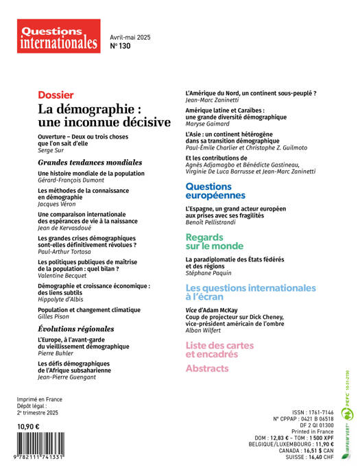 Ce numéro de Questions internationales se propose de faire le point sur les principales dynamiques démographiques actuelles à l’échelle mondiale. Son ambition est de fournir à ses lecteurs les clefs d’analyse pour mieux comprendre les facteurs de cette inconnue aux conséquences décisive . Le cap des 10 milliards d’habitants devrait être franchi en 2050 selon l’ONU. Cette croissance annoncée de la population mondiale va-t-elle s’avérer un bienfait pour les économies des Etats concernés ou au contraire un frein à leur développement ? Dans un contexte de réchauffement climatique et d’épuisement des ressources naturelles, la gestion de la question démographique devient un enjeu de puissance crucial. « Bombe démographique en Afrique, « péril gris » et baisse de la natalité en Europe et Amérique, transition démographique en Asie…