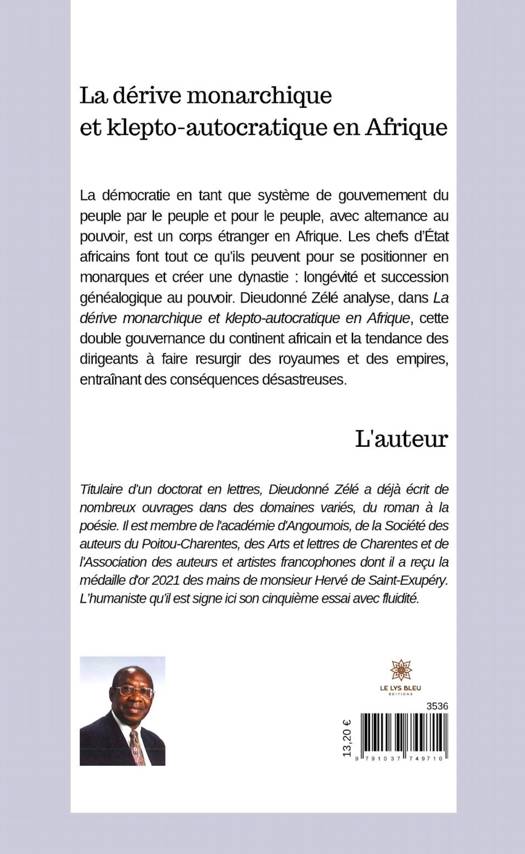 La démocratie en tant que système de gouvernement du peuple par le peuple et pour le peuple, avec alternance au pouvoir, est un corps étranger en Afrique. Les chefs d'État africains font tout ce qu'ils peuvent pour se positionner en monarques et créer une dynastie: longévité et succession généalogique au pouvoir. Dieudonné Zélé analyse, dans La dérive monarchique et klepto-autocratique en Afrique, cette double gouvernance du continent africain et la tendance des dirigeants à faire resurgir des royaumes et des empires, entraînant des conséquences désastreuses.