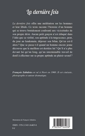 La dernière fois offre une méditation sur les hommes et leur libido. Ce texte raconte l’histoire d’un homme qui se trouve brutalement confronté aux vicissitudes de son propre désir. Aucun petit garçon n’est éduqué dans l’idée que sa virilité, son aptitude à la turgescence, peut, du jour au lendemain, déposer son bilan. Qu’en est-il alors ? Que se passe-t-il quand un homme encore jeune découvre que le meilleur est derrière lui ?