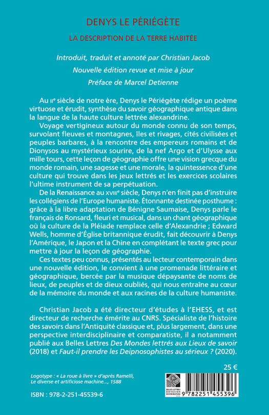 Au IIe siecle de notre ere, Denys le Periegete redige un poeme virtuose et erudit, synthese du savoir geographique antique dans la langue de la haute culture lettree alexandrine. Voyage vertigineux autour du monde connu de son temps, survolant fleuves et montagnes, iles et rivages, cites civilisees et peuples barbares, a la rencontre des empereurs romains et de Dionysos au mysterieux sourire, de la nef Argo et d'Ulysse aux mille tours, cette lecon de geographie offre une vision grecque du monde romain, une sagesse et une morale, la quintessence d'une culture qui trouve dans les jeux lettres et les exercices scolaires l'ultime instrument de sa perpetuation. De la Renaissance au XVIIIe siecle, Denys n'en finit pas d'instruire les collegiens de l'Europe humaniste. Etonnante destinee posthume: grace a la libre adaptation de Benigne Saumaise, Denys parle le francais de Ronsard, fleuri et musical, dans un chant geographique ou la culture de la Pleiade remplace celle d'Alexandrie; Edward Wells, homme d'Eglise britannique erudit, fait decouvrir a Denys l'Amerique, le Japon et la Chine en completant le texte grec pour mettre a jour la lecon de geographie. Ces textes peu connus, presentes au lecteur contemporain dans une nouvelle edition, le convient a une promenade litteraire et geographique, bercee par la musique depaysante de noms de lieux, de peuples et de dieux oublies, qui nous entraine au coeur de la memoire du monde et aux racines de la culture humaniste.