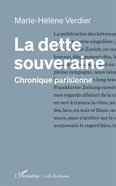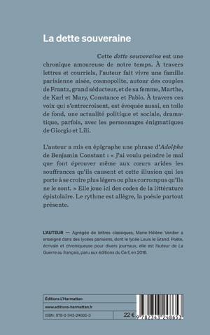 Cette dette souveraine est une chronique amoureuse de notre temps. À travers lettres et courriels, l’auteur fait vivre une famille parisienne aisée, cosmopolite, autour des couples de Frantz, grand séducteur, et de sa femme, Marthe, de Karl et Mary, Constance et Pablo. À travers ces voix qui s’entrecroisent, est évoquée aussi, en toile de fond, une actualité politique et sociale, dramatique, parfois, avec les personnages énigmatiques de Giorgio et Lili.