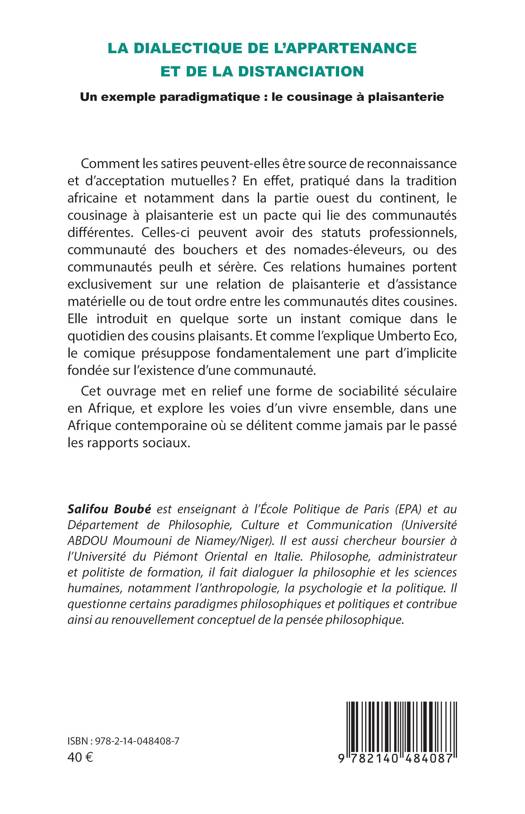 Comment les satires peuvent-elles être source de reconnaissance et d'acceptation mutuelles ? En effet, pratiqué dans la tradition africaine et notamment dans la partie ouest du continent, le cousinage à plaisanterie est un pacte qui lie des communautés différentes. Celles-ci peuvent avoir des statuts professionnels, communauté des bouchers et des nomades-éleveurs, ou des communautés peulh et sérère. Ces relations humaines portent exclusivement sur une relation de plaisanterie et d'assistance matérielle ou de tout ordre entre les communautés dites cousines. Elle introduit en quelque sorte un instant comique dans le quotidien des cousins plaisants. Et comme l'explique Umberto Eco, le comique présuppose fondamentalement une part d'implicite fondée sur l'existence d'une communauté. Cet ouvrage met en relief une forme de sociabilité séculaire en Afrique, et explore les voies d'un vivre ensemble, dans une Afrique contemporaine où se délitent comme jamais par le passé les rapports sociaux.
