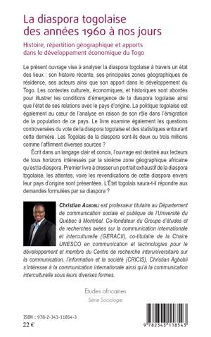 Cet ouvrage analyse la diaspora togolaise à travers un état des lieux : son histoire récente, ses principales zones géographiques de résidence, ses acteurs ainsi que son apport dans le développement du Togo. Les contextes culturels, économiques et historiques sont abordés pour illustrer les conditions d'émergence de la diaspora togolaise ainsi que l'état de ses relations avec le pays d'origine. La politique togolaise est également au coeur de l'analyse en raison de son rôle dans l'émigration de la population de ce pays.