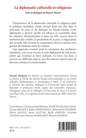 L'importance de la diplomatie culturelle et religieuse dans la politique mondiale, réside surtout dans son rôle dans le processus de paix et de dialogue au Moyen-Orient. Cette diplomatie a prouvé qu'elle est efficace et essentielle dans les relations internationales et joue un rôle crucial dans la résolution des conflits, la promotion de la paix, la négociation des accords. Elle favorise la coopération entre les nations et la gestion des relations entre les nations. Une approche cruciale pour la résolution des problèmes mondiaux, c'est avoir recourt à cette diplomatie de soft power, plutôt que d'utiliser la force militaire. Ce livre vise donc à couvrir ses différents aspects, par des auteurs experts issus de diverses cultures et communautés.