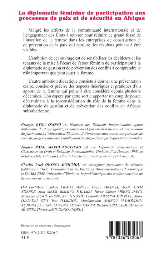 Malgré les efforts de la communauté internationale et de l'engagement des États à oeuvrer pour réduire ce grand fossé de l'insertion de la femme dans les entreprises de construction et de prévention de la paix qui perdure, les résultats peinent à être visibles. L'ambition de cet ouvrage est de sensibiliser les décideurs et les tenants de la mise à l'écart de l'atout féminin de participation à la diplomatie de gestion et de prévention des conflits à comprendre le rôle important que peut jouer la femme. L'autre ambition didactique consiste à donner une présentation claire, concise et précise des aspects théoriques et pratiques d'un apport de la femme qui peine à être considéré depuis plusieurs décennies. L'on espère par cette sortie apporter un coup de pouce déterminant à la re-considération du rôle de la femme dans la diplomatie de gestion et de prévention des conflits en Afrique subsaharienne.